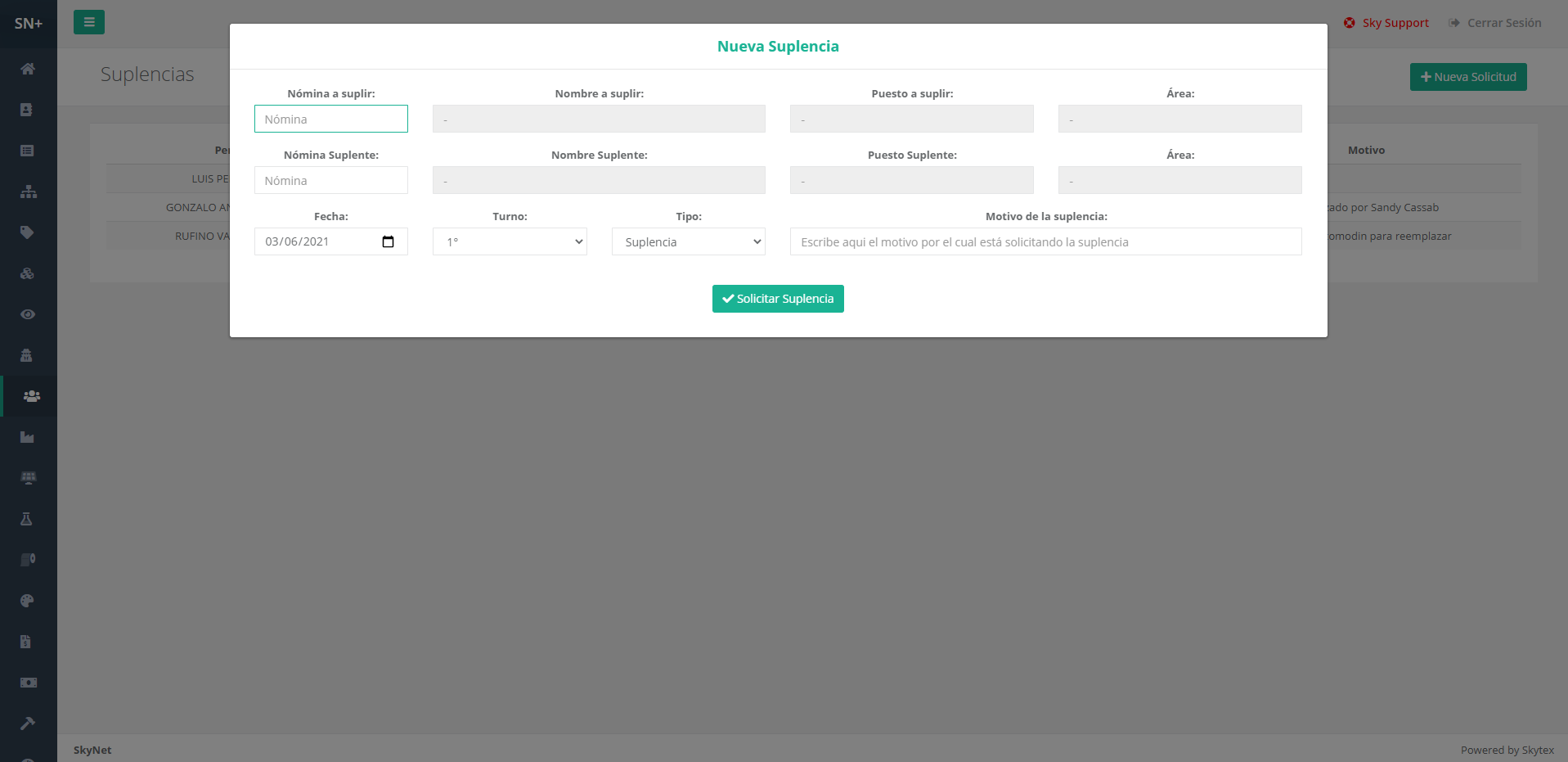 Deberás ingresar el número de nómina (completo a 8 dígitos) de la persona a suplir, asi como de la persona que lo suplirá, con esto, se cargará la información del nombre, puesto y área: