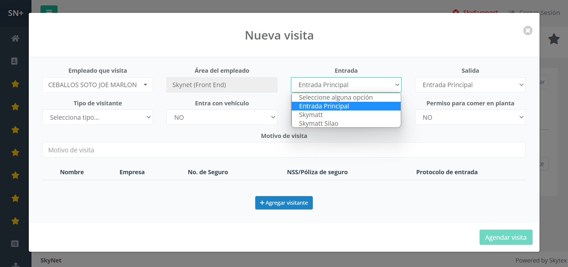 En la esquina superior derecha se tiene el botón de "Nueva Visita", el cual al darle click, abrirá un recuadro para ingresar los datos de la visita que se requiere solicitar: